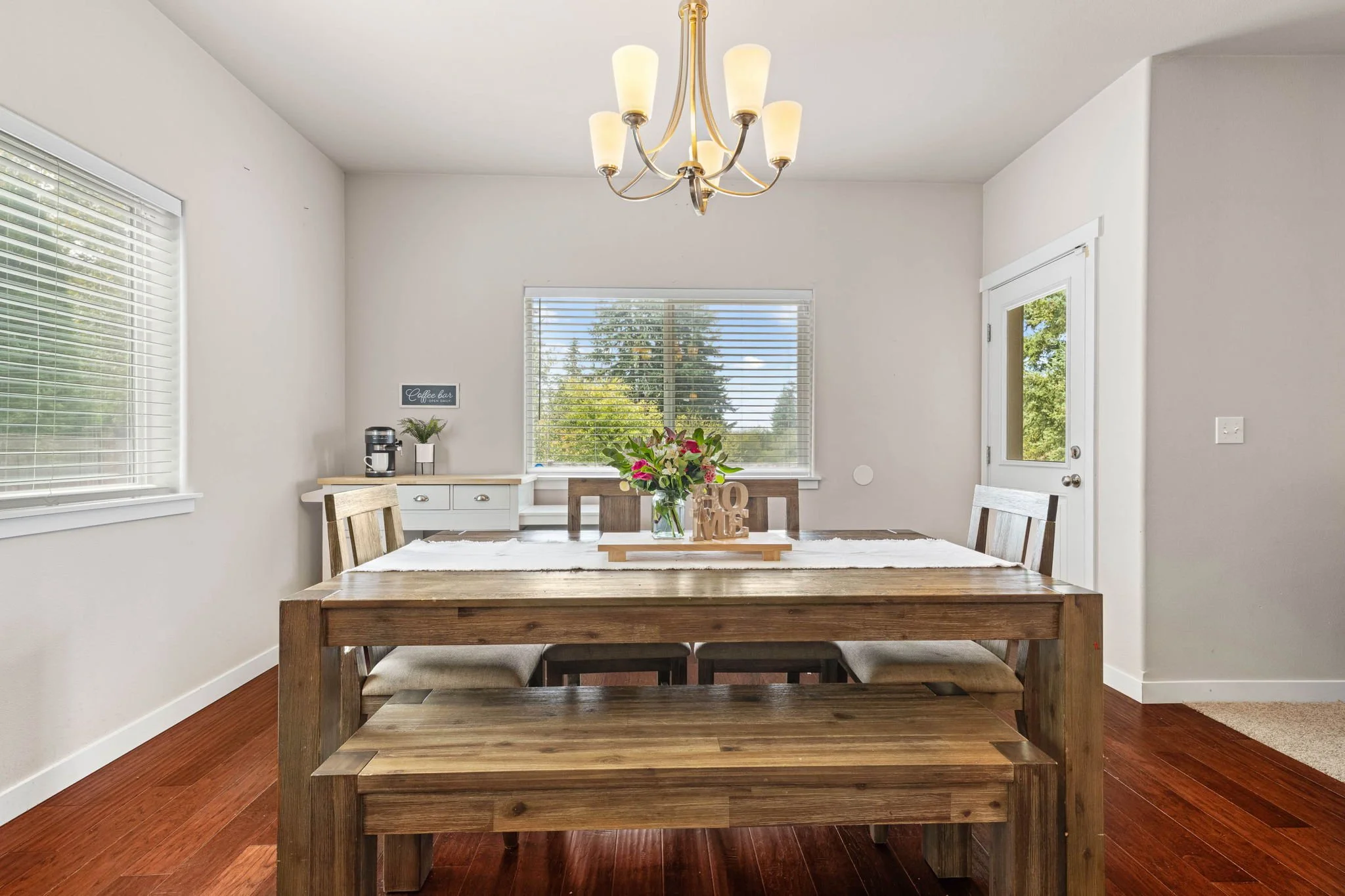 Welcome home to an inviting retreat perfect for both comfort (AC!) and entertaining! The open floor plan features a spacious island with eating bar, walk-in pantry, and Stainless Steel appliances with a natural gas range for the home chef. A main-floor office/4th bedroom adds flexibility, while the upstairs primary suite offers dual closets, a spa-like 5-piece bath, and sweeping views. Enjoy privacy with no back neighbors! The fenced backyard with partially covered patio and the charming front porch make outdoor living easy. With a community park across the street and quick access to JBLM, Yelm, and Olympia, this home checks every box!